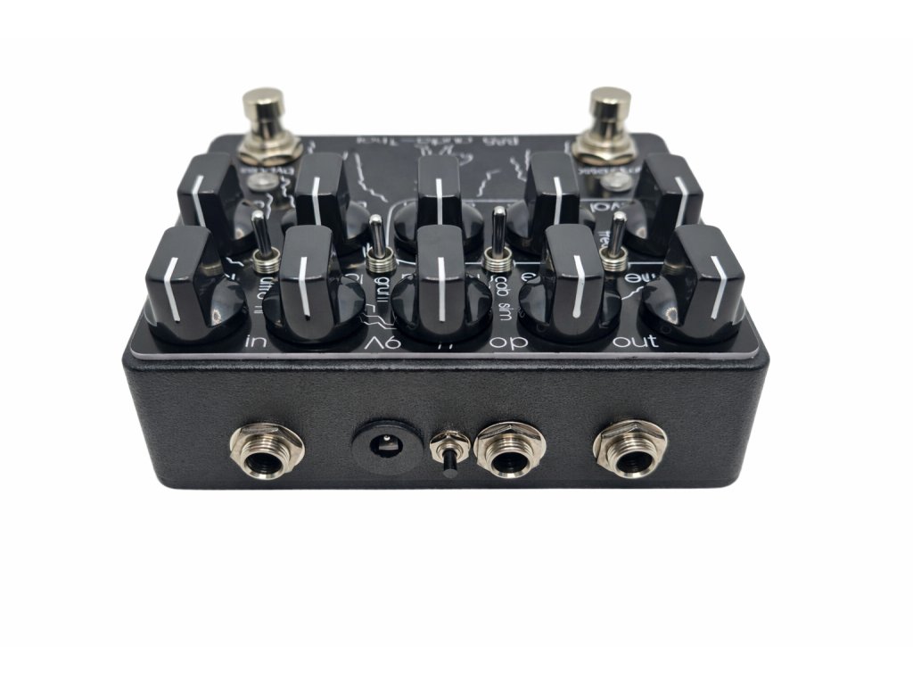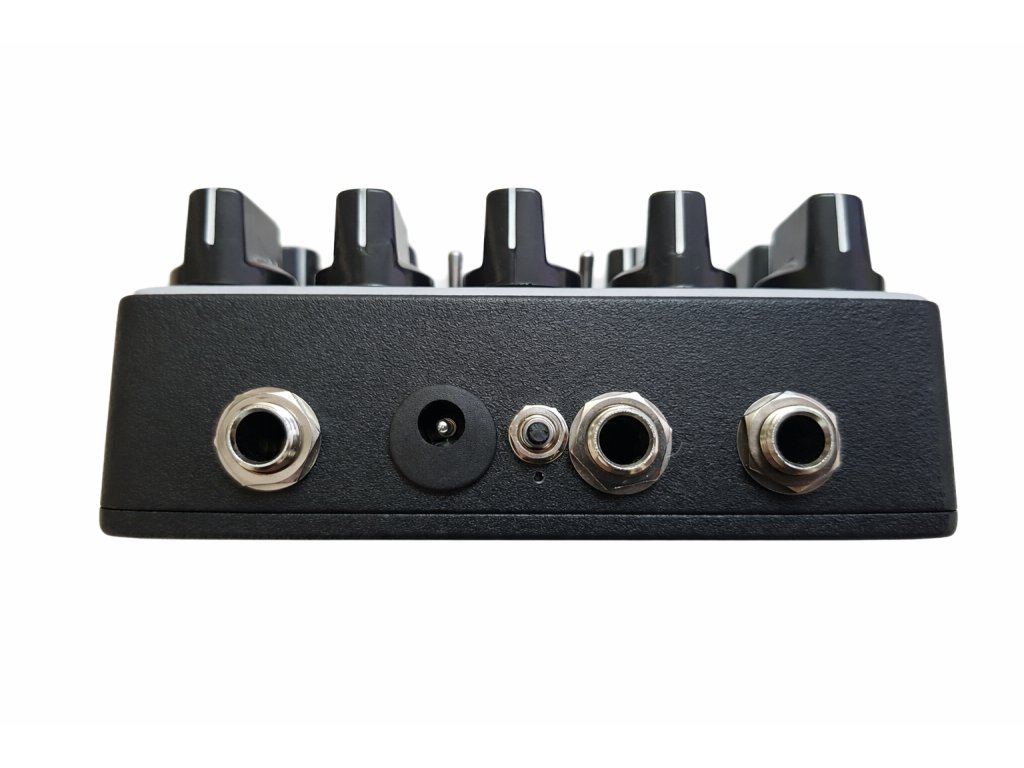 The preamp section features TREBLE (18 kHz), HI MID (2.3 kHz), LO MID (300 Hz), and LOW (100 Hz) controls. The amount of distortion is set using the DRIVE potentiometer, which directly affects the VOLUME control. The balance between the clean and distorted signals is adjusted with the BLEND control. The distortion character can be further shaped using two toggle switches, ULTRA HI and GRUNT, which independently control the saturation of high and low frequencies.The pedal also includes a compressor section with COMP. VOL for setting the compressor output level, ATTACK to control the response time, SUSTAIN to adjust the compression intensity, and a FREQ toggle switch for frequency selection. Thanks to this frequency control, the compressor can also be used as a frequency booster.The preamp and compressor operate independently, allowing either section to be engaged separately or both simultaneously.The pedal features one input (IN) and two outputs. The OUT output is a standard output for connection to an amplifier or another effect. The D.O. (Direct Out) output is equipped with a cabinet simulation (Ampeg SVT 610), which can be enabled using the CAB SIM toggle switch, and includes a TRS DI box. This allows the signal to be sent directly to a PA system or an audio interface for recording.Next to the D.O. output, there is a ground lift switch. When the red LED below the switch is illuminated, the ground is disconnected.